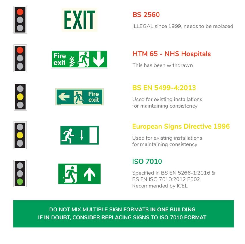 - BS5499 states the sign must have a green background (safety colour) and white pictogram (contrast colour)